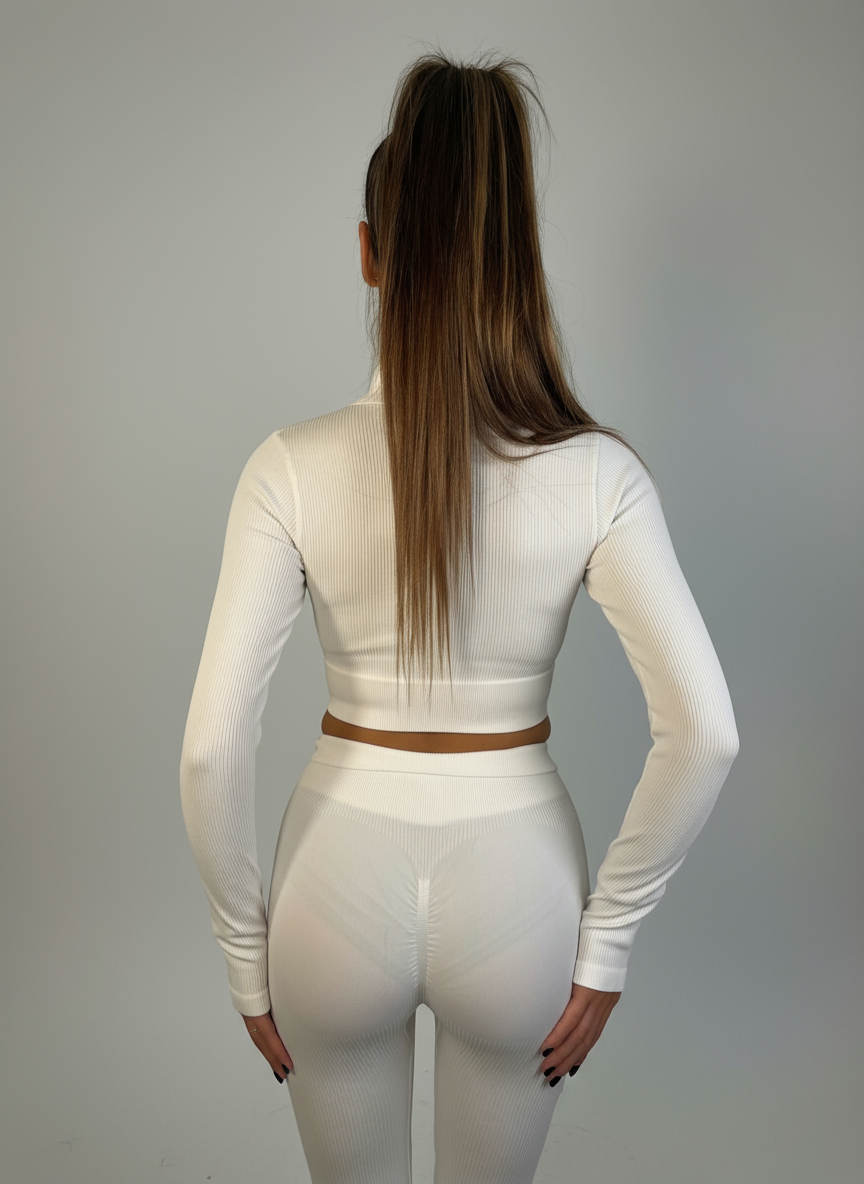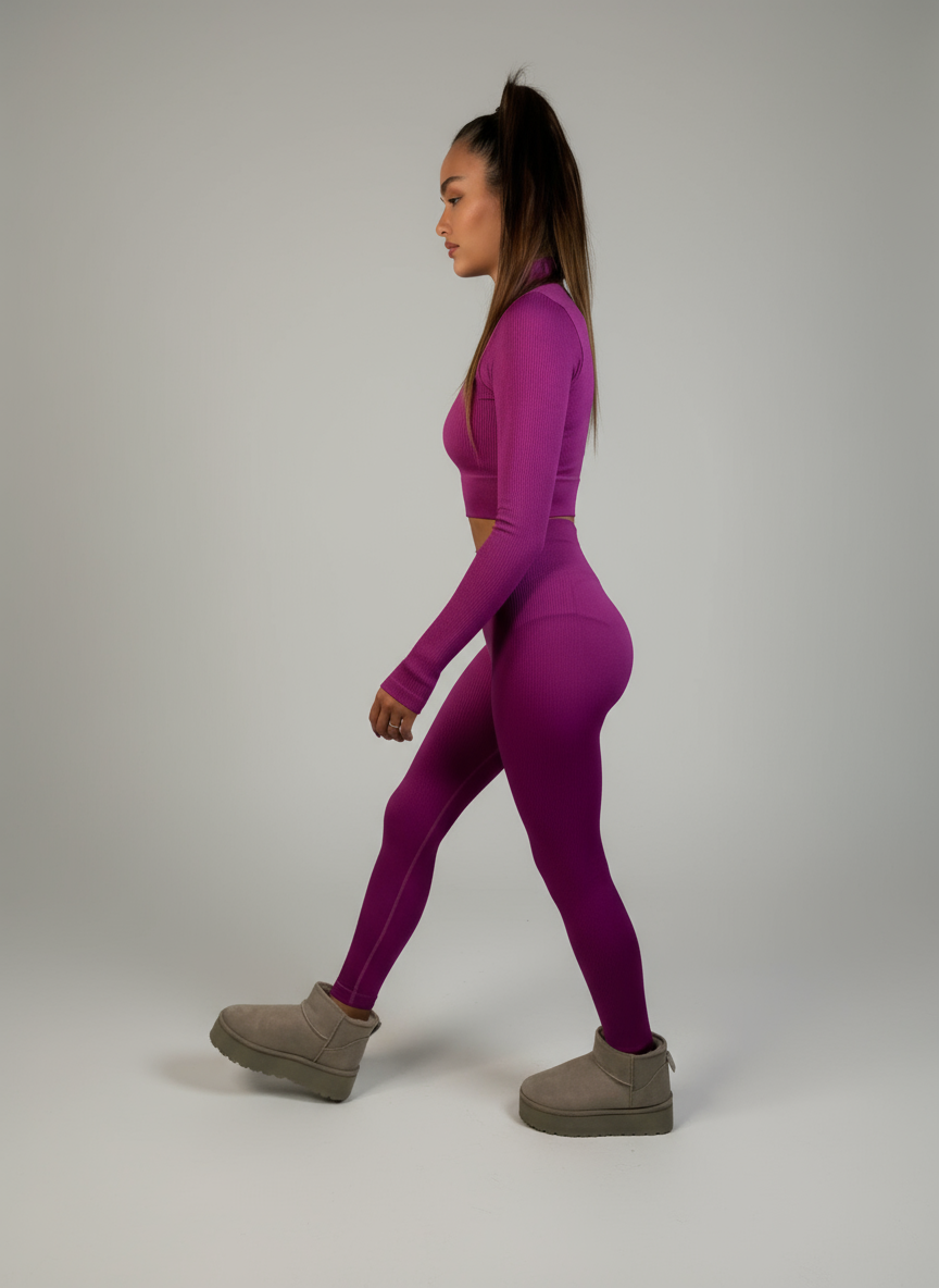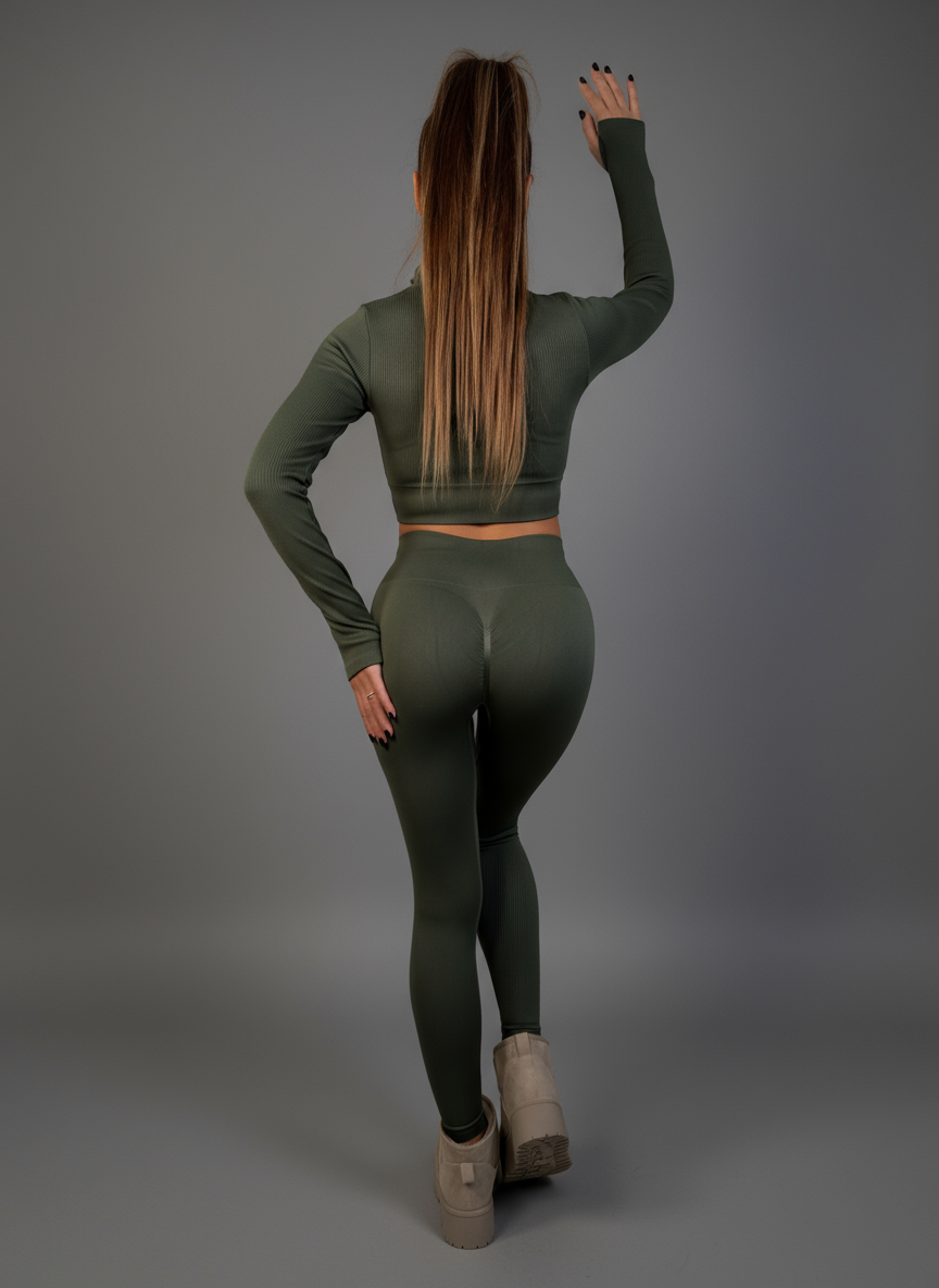 Set Lolly Push-Up in tessuto effetto seconda pelle: top con zip e scollo a V che sostiene e modella il seno, leggings a vita alta con effetto push-up sui glutei. Morbido, aderente e confortevole, perfetto per everyday, palestra o look athleisure.