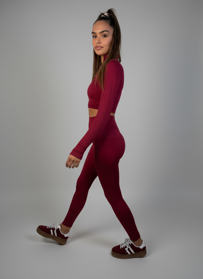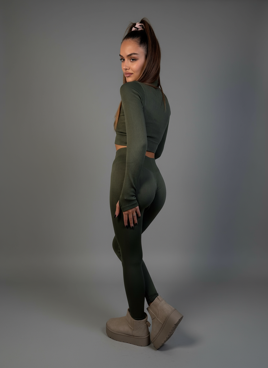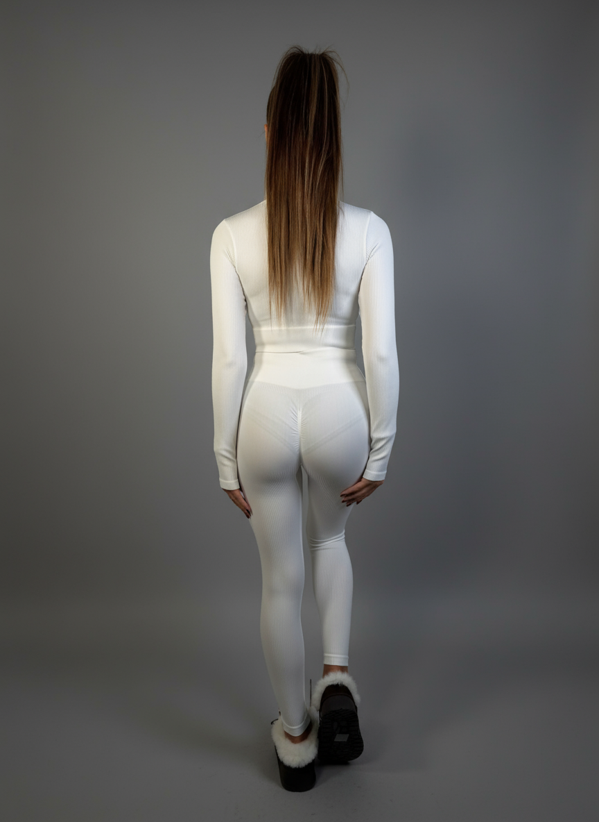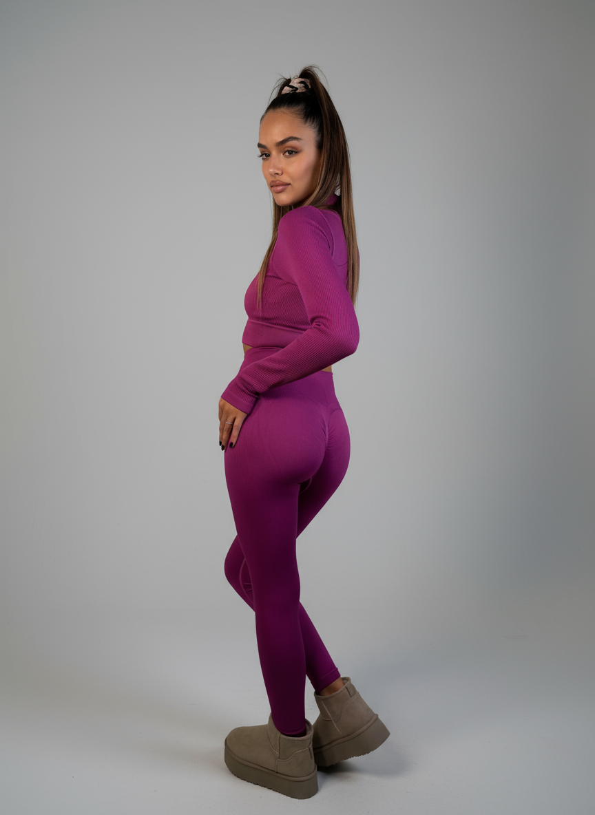 Set Lolly Push-Up in tessuto effetto seconda pelle: top con zip e scollo a V che sostiene e modella il seno, leggings a vita alta con effetto push-up sui glutei. Morbido, aderente e confortevole, perfetto per everyday, palestra o look athleisure.